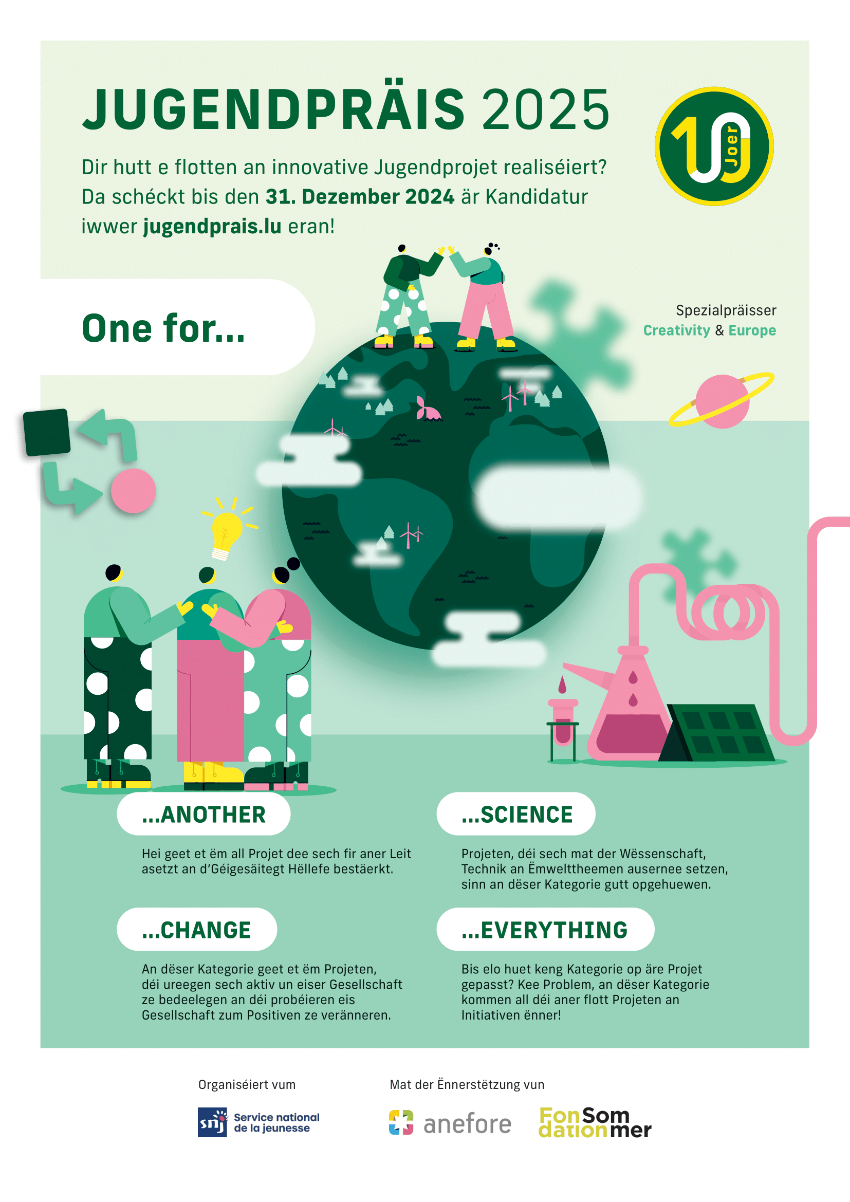 Pour cette 6ième édition et le 10ième anniversaire de l’initiative, nous avons choisi quatre catégories avec le but de pouvoir attirer une grande variété de projets :