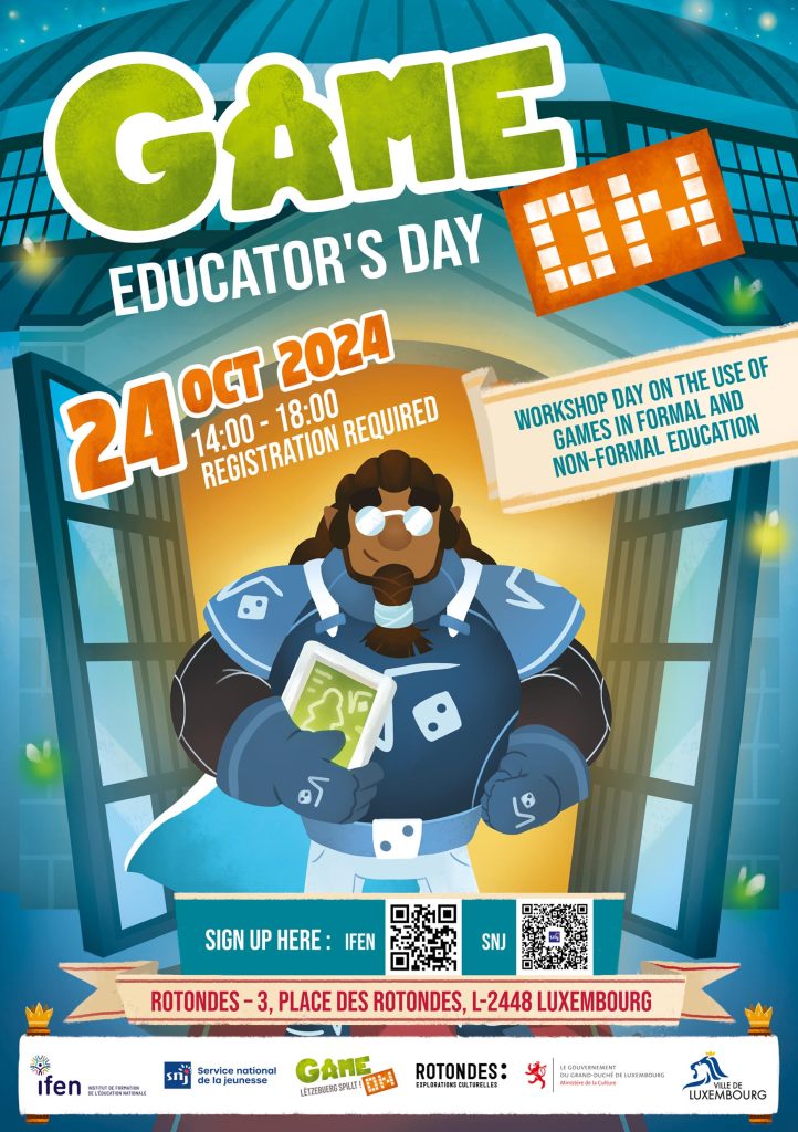 Den Educator’s Day ass eng Formatioun am Kader vun der Spill-Foire Game On, wou et ëm de pedagogeschen Asaz vun analogen an digitale Spiller an der formaler an non-formaler Bildung geet. Dës Formatioun riicht sech virun allem u Personal, dat mat Jonken ab 10 Joer schafft, an ass fir 4 Stonne vum Dispositif vun der Formation continue unerkannt. Den Event gëtt vum SNJ zesumme mam IFEN organiséiert, a Partnerschaft mat de Rotondes an der Game On asbl.