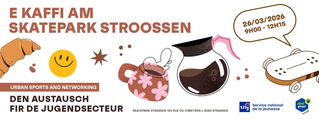 De Kaffi am … ass zeréck aus der Wanterpaus an den SNJ luet déi Professionell aus dem Jugendsecteur op säin nächst Austauschtreffen E Kaffi am Skatepark Strossen” an. Déi entretemps 8. Editioun steet déi Kéier ënnert dem Theema “URBAN SPORTS AND NETWORKING” a beschäftegt sech am breede Sënn mat Plazen,wou Jonker sech dobausse beweegen a begéine kënnen.