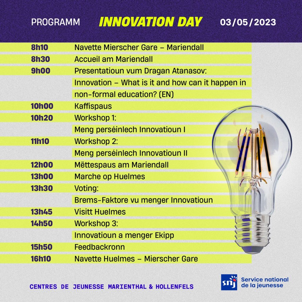Bei Froe kënnt dir iech bei der Ekipp Innovation Jeunesse mellen: manon.assa@snj.lu & chelsea.reuter@snj.lu