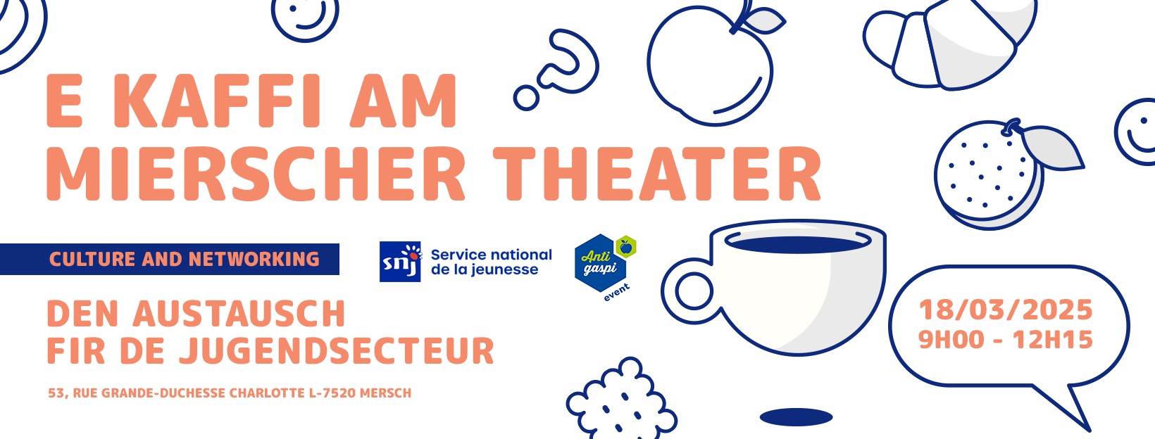 De Kaffi am Mierscher Theater fënnt Dënschdes, den 18. Mäerz 2025 vun 9h00 bis 12h15 am Mierscher Theater (53, Rue Grande-Duchesse Charlotte L-7520 Mersch) statt.