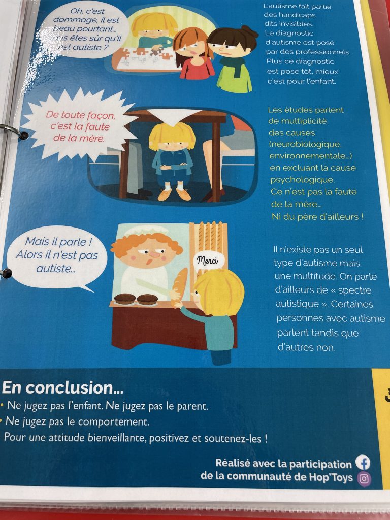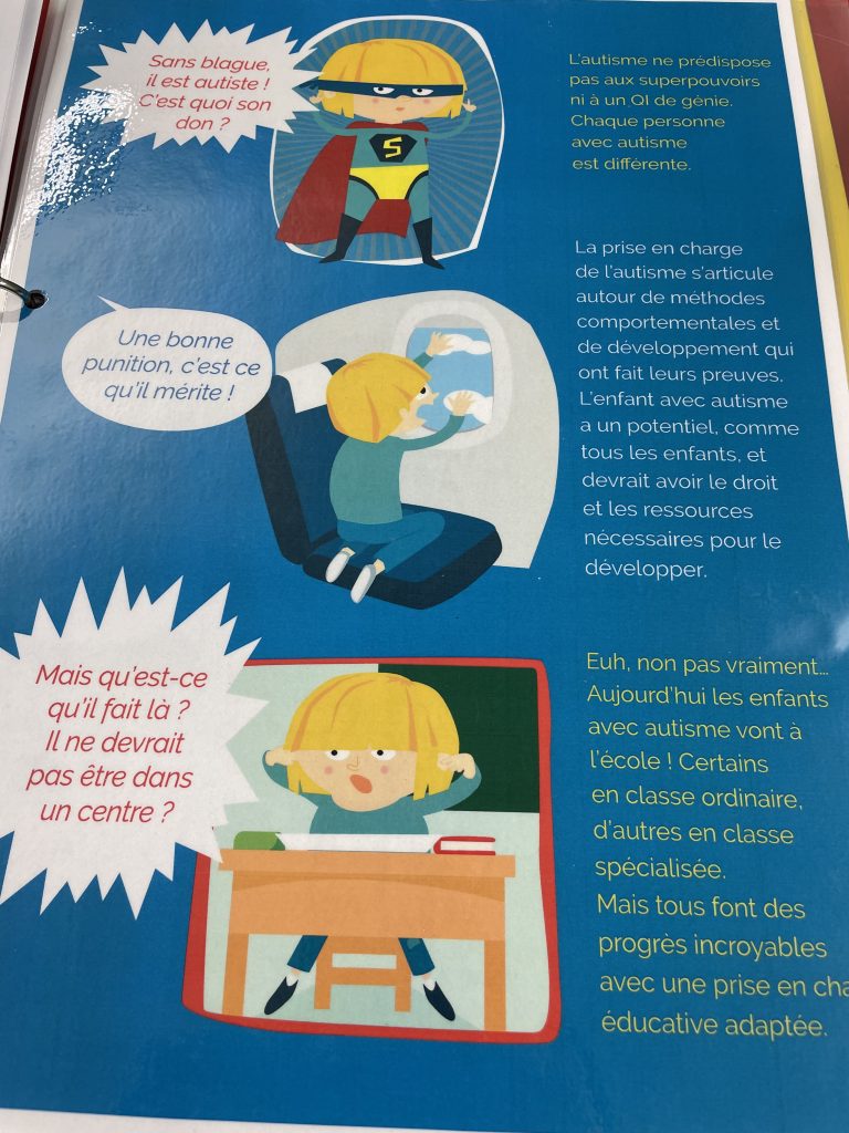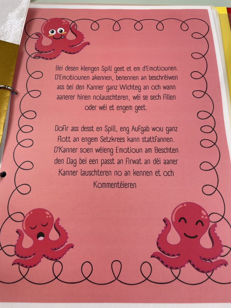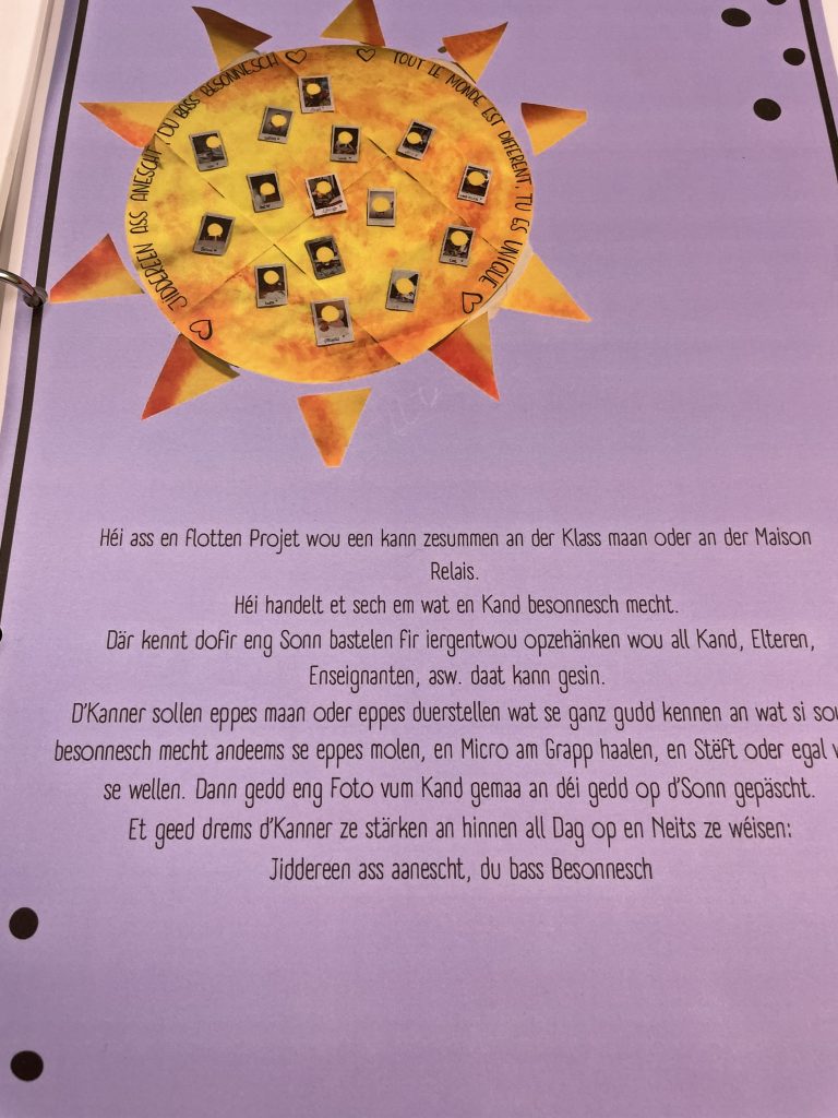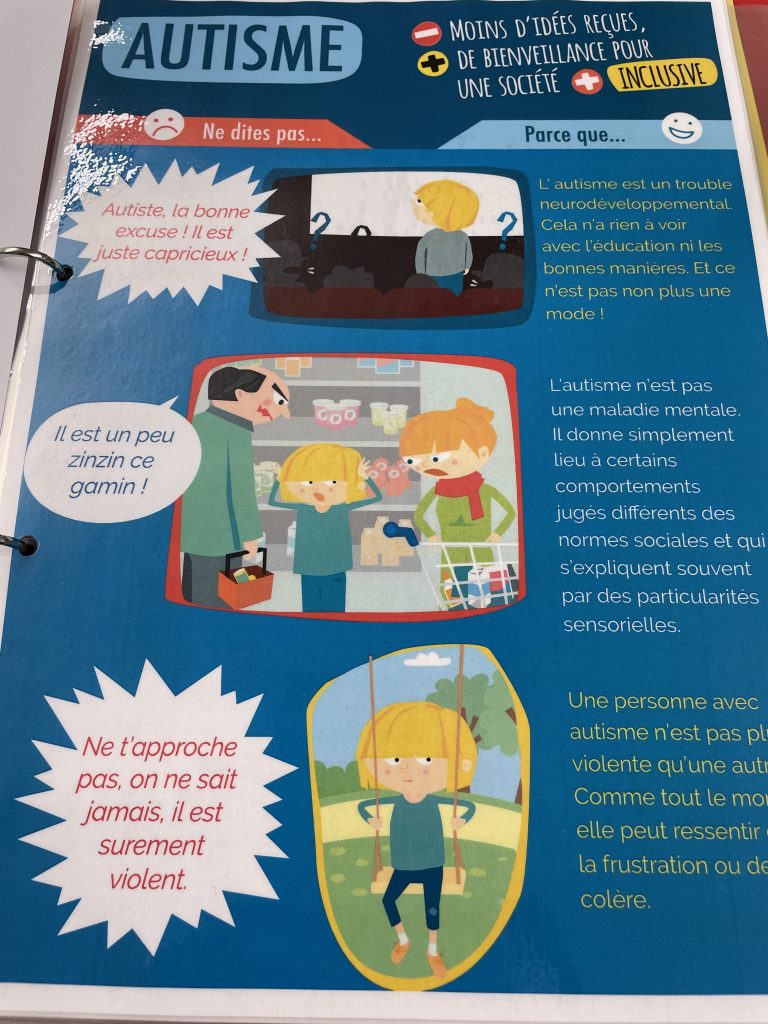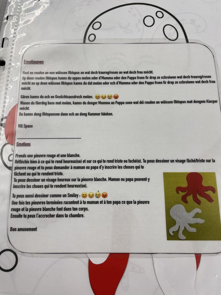 « Leo et la pieuvre » A l’époque notre SEA a eu le grand privilège d’accompagner un enfant atteint du trouble du spectre autistique que je vais nommer T. Nous avons très vite compris que pour que l’inclusion ait la chance de fonctionner, il est impératif que cela aille de pair avec une sensibilisation de toutes les personnes concernées. Il nous semblait impératif de traiter le sujet en profondeur, et qu’une simple explication ne pouvait suffire. C’est ainsi que nous avons décidé de créer une boîte regroupant des livres, des informations, des jeux et bricolages ayant pour objectif de traiter le sujet de l’autisme mais aussi de parler des différences de tout un chacun. Ainsi certains objectifs se sont cristallisés. -sensibiliser au thème de l’autisme -aborder la thématique sous différents angles – permettre aux enfants de devenir plus empathiques -permettre aux enfants de partager leur ressentis et leurs idées pour mieux appréhender les différences au jour le jour Ensuite nous avons décidé de prêter la boîte à chaque famille côtoyant l’enfant atteint de spectre autistique. Le but était que chaque famille ait la possibilité de se familiariser avec la thématique et de prendre contact avec l’équipe éducative en cas de doutes ou de questions. Chaque famille avait ensuite la possibilité de prendre une photo de son enfant ou de sa famille qu’elle pouvait glisser dans la boite de l’activité qui lui avait plu le plus. Une fois la boîte retournée, les photos des enfants étaient collées sur un grand soleil coloré affiché dans le couloir du SEA où les enfants sont récupérés par leurs parents. Sur le soleil on peut lire : « Tout le monde est différent ! Tu es unique ». Le matériel présent dans la boite était également à la disposition de tous les enfants au sein du SEA. Ceci a pu montrer aux enfants que cela peut arriver à tout le monde d’être dépassé par ses émotions. Le fait de mettre des mots sur les émotions et son ressenti permet de mieux comprendre et de moins juger.