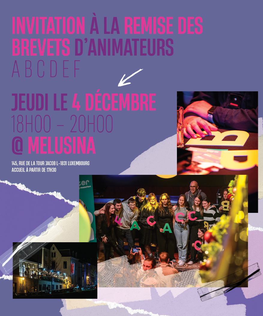 La cérémonie de remise des brevets d’animateur se tiendra le jeudi 4 décembre 2025 au Melusina à Clausen.